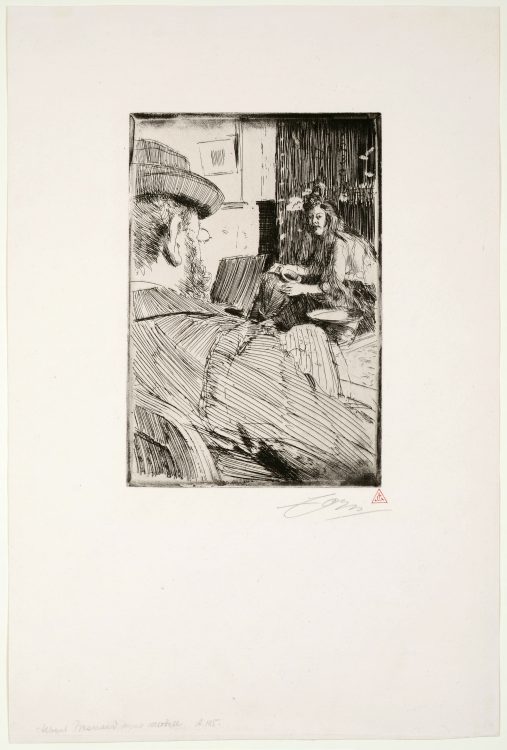 Another close collaboration is revealed by two etchings of the same scene. Anders Zorn, a Swedish artist who lived in Paris for several years, captured his friend Albert Besnard in the act of drawing a female model. The same composition appears in Besnard’s print La Femme au vase. While Zorn’s etching is lively and sketchlike, Besnard’s presents a darker view, steeped in shadowy aquatint.